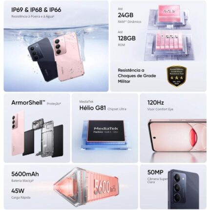 Apresentamos o Realme C75, um smartphone que une desempenho excepcional e tecnologia de ponta para atender até os usuários mais exigentes. Equipado com 8 GB de RAM e 256 GB de armazenamento interno, ele oferece amplo espaço e alta velocidade para armazenar seus aplicativos e arquivos, garantindo performance ágil e sem interrupções. Principais Características Tela: O display IPS LCD de 6,72 polegadas com resolução Full HD+ (2400 x 1080 pixels) e taxa de atualização de 90 Hz proporciona uma experiência visual imersiva com cores vibrantes e transições ultra suaves. Perfeito para vídeos, jogos e navegação. Câmeras: Capture todos os momentos com detalhes incríveis. A câmera frontal de 8 MP garante selfies nítidas, enquanto o sistema de câmera traseira dupla, com uma lente principal de 50 MP e uma lente auxiliar com Inteligência Artificial, proporciona fotos com qualidade profissional, mesmo em condições de pouca luz. Processador: Equipado com o potente MediaTek Helio G92 Max, o Realme C75 oferece um desempenho ágil e eficiente, perfeito para multitarefas e jogos exigentes, sem travamentos ou lentidão. Design e Durabilidade Conectividade: Desfrute de conexões rápidas com 4G, Wi-Fi 5 Dual-Band, e Bluetooth 5.0, além de som mono para complementar sua experiência multimídia. Resistência: Com certificações IP69 e MIL-STD-810H, o Realme C75 é resistente à água, poeira e condições extremas, garantindo durabilidade e confiança, mesmo em ambientes desafiadores. Bateria e Sistema Operacional Bateria: A robusta bateria de 6.000 mAh, com carregamento rápido de 45W, garante que você passe mais tempo utilizando o smartphone e menos tempo na tomada. Sistema Operacional: Com o Android 14 e a interface Realme UI 5.0, o Realme C75 oferece uma experiência de usuário fluida, moderna e personalizada, com acesso a todas as funções mais recentes do sistema. Conteúdo da Embalagem Smartphone Realme C75 Carregador Cabo USB Capa protetora Agulha para ejeção de cartão SIM Guia rápido Transforme sua rotina com o Realme C75, onde tecnologia avançada e design robusto se unem para proporcionar uma experiência móvel superior, seja para o trabalho ou para o lazer. ……………………………..…………………………………………………………………….. DIMENSÕES E PESO: Altura: 165.70mm Largura: 76.22mm Profundidade: 7.94mm Peso: 1,97 kg
